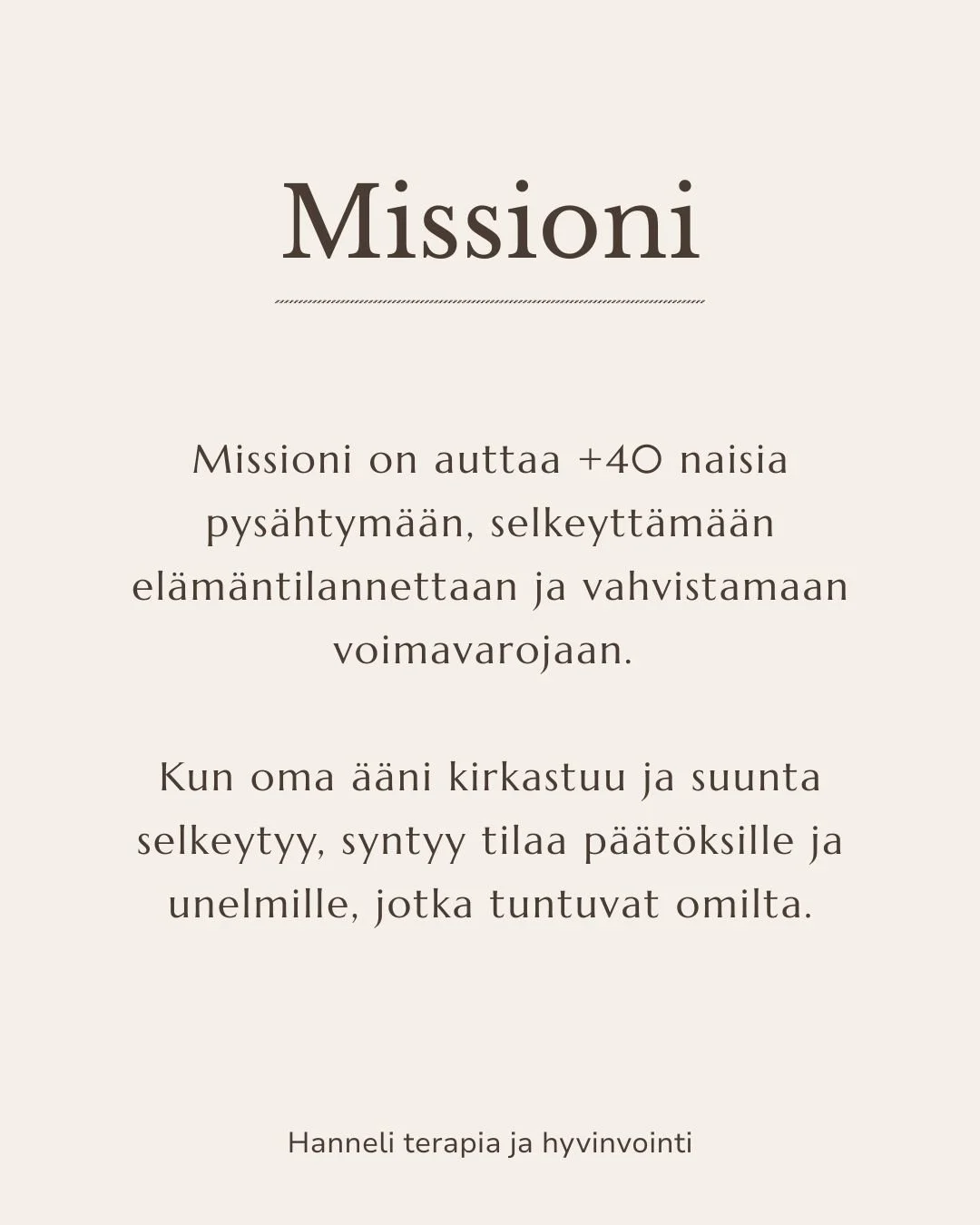 Missioni on auttaa +40 naisia pysähtymään, selkeyttämään elämäntilannettaan ja vahvistamaan voimavarojaan. Kun oma ääni kirkastuu ja suunta selkeytyy, syntyy tilaa päätöksille jotka tuntuvat omilta.