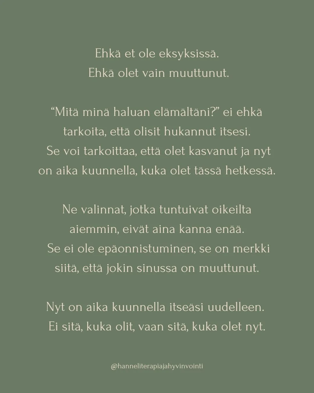 Uupumus ja suunnan kadottaminen eivät ole loppusi – ne voivat olla kutsu muutokseen. Lyhytterapia auttaa sinua tunnistamaan mikä kuormittaa ja löytämään oman voimasi ja sisäisen äänesi.