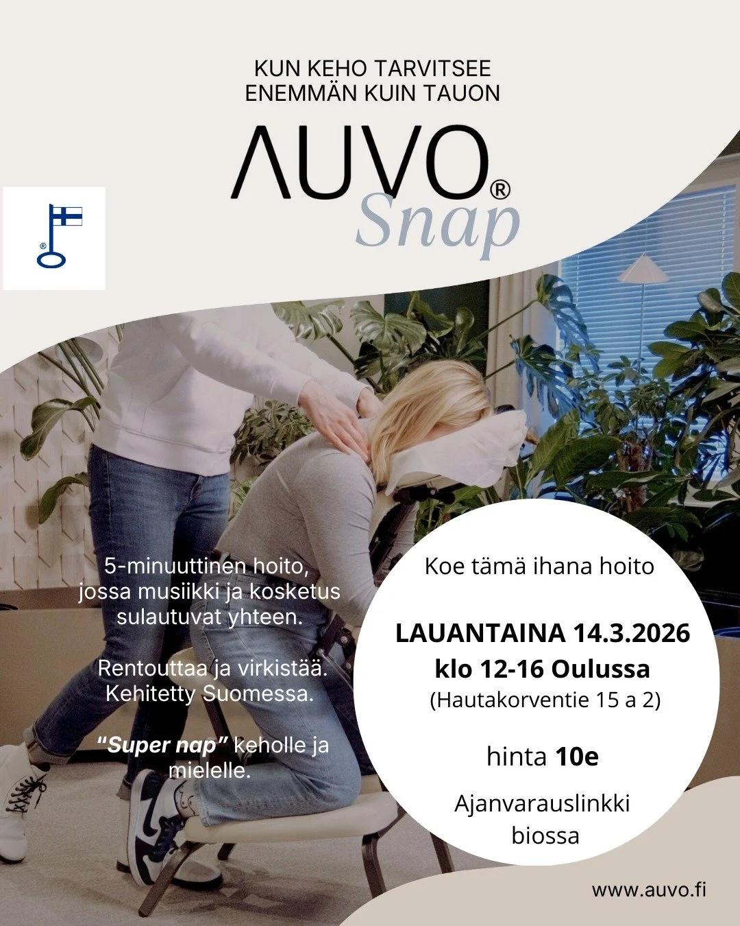 Auvo Brain Relief® on täysin Suomessa kehitetty kosketushoito. Musiikkiin integroitu hoito on vaikuttava, lempeä ja tehokas. Se auttaa pitkittyneen stressin katkaisussa ja tasapainottaa sekä kehoa että mieltä.
